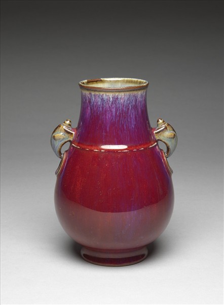 仿銅壺器形,頸飾兩獸首銜環耳及弦紋一道。胎骨較厚,器面天藍釉,窯變深紫色,口沿與兩耳多現褐色邊。器內全部淺藍底釉米黃色。底印有「大清乾隆年製」六篆字款。