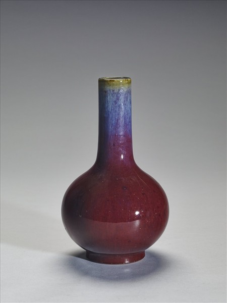 斂圓口,長頸,碩腹,矮圈足。胎骨厚重,頸部釉色天藍,腹部深紫,口沿一週黃褐色,釉面多細小棕眼。底印有「雍正年製」四篆字款。