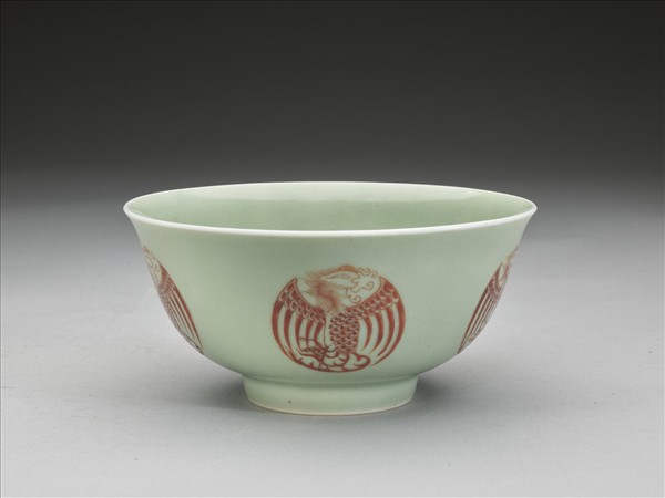圓口,唇緣微外侈,弧形深壁,平底,矮圈足。器壁通施冬青釉,釉色呈粉綠。外壁裝飾五個描紅團鳳紋,碗心亦繪一團鳳紋,鳳首、軀體與鳳尾成S型,雙翅展開於兩側,使圖案成圓形,線條粗細分明。底有青花書「大清雍正年製」二行六字楷款,外加雙圈。