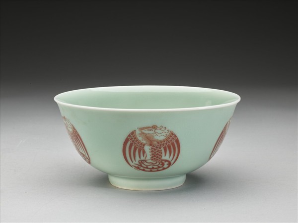 圓口,唇緣微外侈,弧形深壁,平底,矮圈足。器壁通施冬青釉,釉色呈粉綠。外壁裝飾五個描紅團鳳紋,碗心亦繪一團鳳紋,鳳首、軀體與鳳尾成S型,雙翅展開於兩側,使圖案成圓形,線條粗細分明。底有青花書「大清雍正年製」三行六字篆款。