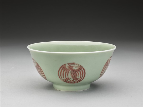 圓口,唇緣微外侈,弧形深壁,平底,矮圈足。器壁通施冬青釉,釉色呈粉綠。外壁裝飾五個描紅團鳳紋,碗心亦繪一團鳳紋,鳳首、軀體與鳳尾成S型,雙翅展開於兩側,使圖案成圓形,線條粗細分明。底有青花書「大清雍正年製」二行六字楷款,外加雙圈。