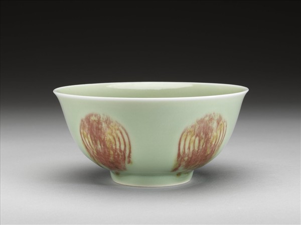 圓口,唇緣微外侈,弧形深壁,平底,矮圈足。器壁通施冬青釉,釉色呈粉綠。外壁裝飾五個紅彩團鳳紋,碗心亦繪一團鳳紋,鳳首、軀體與鳳尾成S型,雙翅展開於兩側,使圖案成圓形,紅彩發色呈暗紅色,可能因流動造成色料暈散,圖案模糊不清。底有青花書「大清雍正年製」二行六字楷款,外加雙圈。