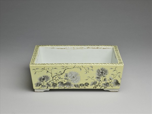 長方花盆,敞口,直壁,四方足﹔器面於瓷胎面上粉彩花卉圖案。口沿為回紋。器裡白色。四壁為黃地墨繪菊花叢,底部紅書「體和殿製」篆款,底部並有兩圈支釘共有十六處釘點。體和殿是慈禧居住儲秀宮時的休息用膳處。
