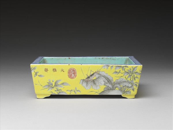長方花盆,敞口、淺直壁,四矮足。體厚,足底無釉,底部並有兩圈支釘共有十二處釘點。器裡外於釉上作低溫粉彩裝飾。器裡為松石色素地;口沿為藍色回紋;外壁則在黃地上墨彩園圃圖,描繪秋日園圃景色,蘿蔔成熟、菊花盛開,蜜蜂、蝴蝶飛舞,蟋蟀之類草蟲攀鳴。一面橫署「大雅齋」三字及「天地一家春」的海水雙龍篆印款。底部朱書「永慶長春」雙行楷款。此款類為慈禧太后旨令燒造的器皿。