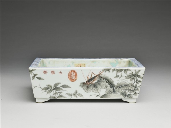 長方盆,直壁,平底,厚胎,器底有支釘痕兩圈。本款水仙花盆外壁高低錯落的海棠枝葉、蘿蔔及螽斯等紋飾,呈現恬適的田園景觀。紋飾用墨彩鈎勒,填彩之前先上一層乳濁的玻璃白,續用墨彩渲染出濃淡不一的灰階。留白處朱書「大雅齋」楷款及橢圓海龍紋「天地一家春」篆印,底書「永慶長春」楷款。