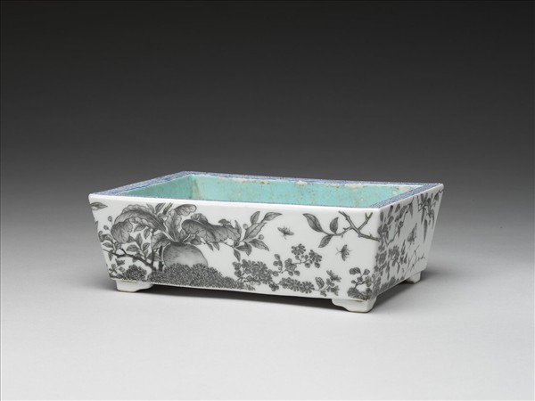 長方盆,直壁,平底,厚胎,器底有支釘痕兩圈。本款水仙花盆外壁高低錯落的海棠枝葉、蘿蔔及螽斯等紋飾,呈現恬適的田園景觀。紋飾用墨彩鈎勒,填彩之前先上一層乳濁的玻璃白,續用墨彩渲染出濃淡不一的灰階。留白處朱書「大雅齋」楷款及橢圓海龍紋「天地一家春」篆印,底書「永慶長春」楷款。