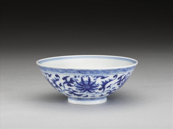 敞口,深壁,矮圈足。外壁畫番蓮五朵,口沿畫卷草紋一周,底邊畫如意雲紋一周,口足間加飾青線五道。碗內口沿畫雙線,底心畫番蓮一朵,邊加雙線。底有青花書「大清乾隆年製」三行六字篆款。