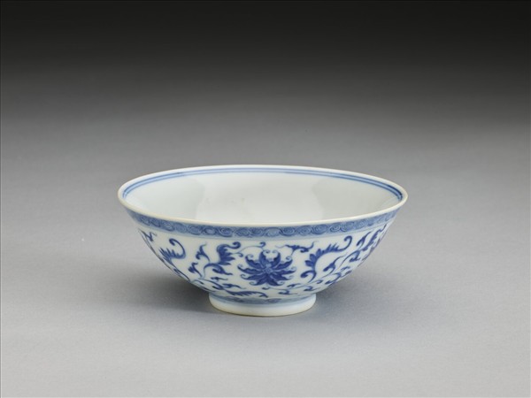 敞口,深壁,矮圈足。外壁畫番蓮五朵,口沿畫卷草紋一周,底邊畫如意雲紋一周,口足間加飾青線五道。碗內口沿畫雙線,底心畫番蓮一朵,邊加雙線。底有青花書「大清乾隆年製」三行六字篆款。