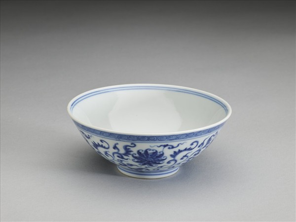 敞口,深壁,矮圈足。外壁畫番蓮五朵,口沿畫卷草紋一周,底邊畫如意雲紋一周,口足間加飾青線五道。碗內口沿畫雙線,底心畫番蓮一朵,邊加雙線。底有青花書「大清乾隆年製」三行六字篆款。