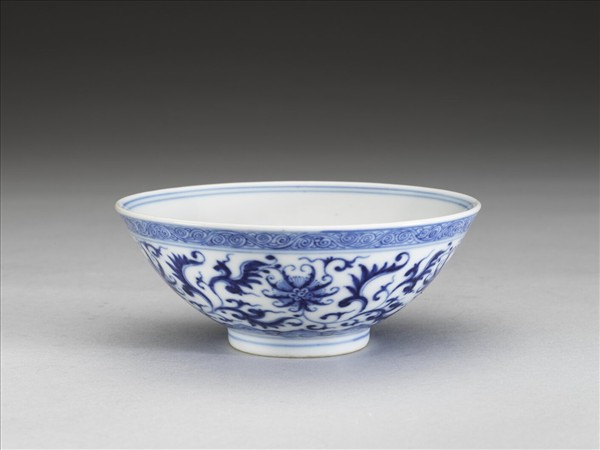 敞口,深壁,矮圈足。外壁畫番蓮五朵,口沿畫卷草紋一周,底邊畫如意雲紋一周,口足間加飾青線五道。碗內口沿畫雙線,底心畫番蓮一朵,邊加雙線。底有青花書「大清乾隆年製」三行六字篆款。
