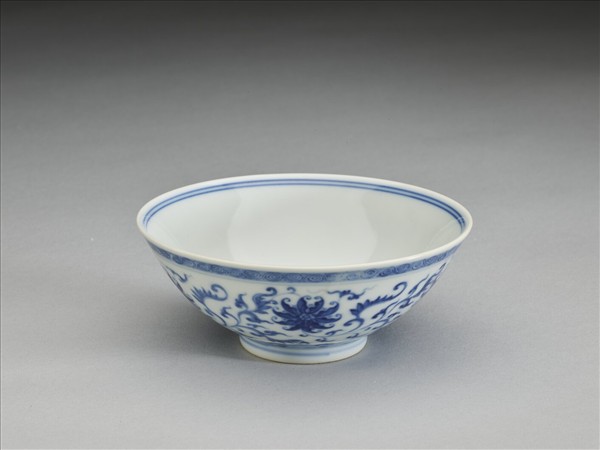 敞口,深壁,矮圈足。外壁畫番蓮五朵,口沿畫卷草紋一周,底邊畫如意雲紋一周,口足間加飾青線五道。碗內口沿畫雙線,底心畫番蓮一朵,邊加雙線。底有青花書「大清乾隆年製」三行六字篆款。