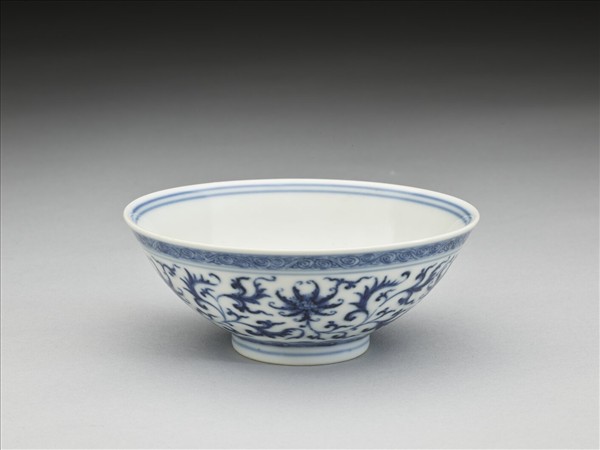 敞口,深壁,矮圈足。外壁畫番蓮五朵,口沿畫卷草紋一周,底邊畫如意雲紋一周,口足間加飾青線五道。碗內口沿畫雙線,底心畫番蓮一朵,邊加雙線。底有青花書「大清乾隆年製」三行六字篆款。