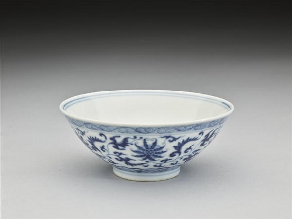 敞口,深壁,矮圈足。外壁畫番蓮五朵,口沿畫卷草紋一周,底邊畫如意雲紋一周,口足間加飾青線五道。碗內口沿畫雙線,底心畫番蓮一朵,邊加雙線。底有青花書「大清乾隆年製」三行六字篆款。