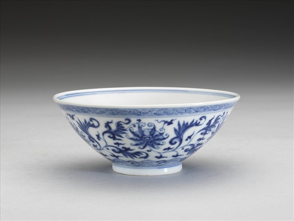 敞口,深壁,矮圈足。外壁畫番蓮五朵,口沿畫卷草紋一周,底邊畫如意雲紋一周,口足間加飾青線五道。碗內口沿畫雙線,底心畫番蓮一朵,邊加雙線。底有青花書「大清乾隆年製」三行六字篆款。