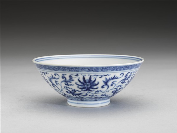敞口,深壁,矮圈足。外壁畫番蓮五朵,口沿畫卷草紋一周,底邊畫如意雲紋一周,口足間加飾青線五道。碗內口沿畫雙線,底心畫番蓮一朵,邊加雙線。底有青花書「大清乾隆年製」三行六字篆款。