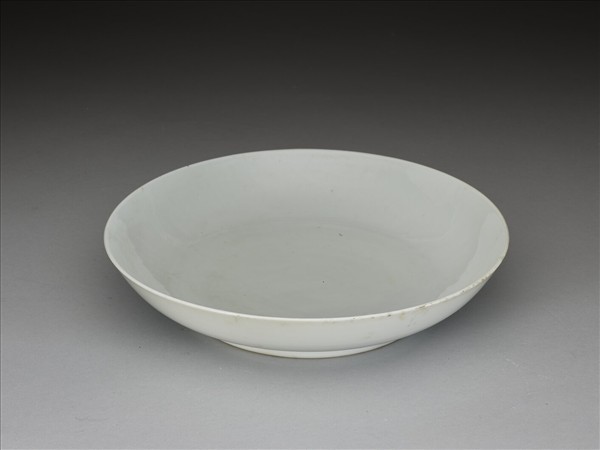 敞口,淺壁弧形,矮圈足。胎質較薄,器內外壁滿施白釉,盤底純白,樸素無紋飾,圈足露胎。底有青花書「大清光緒年製」二行六字楷款。