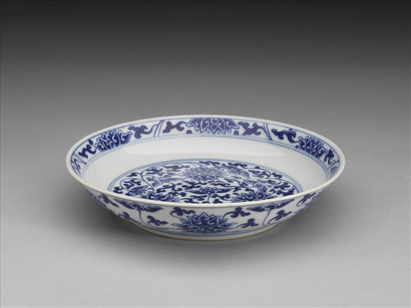 侈口窄唇,淺壁,矮圈足。胎質較薄,外壁畫盛開及待開之纏枝番蓮共十二朵,盤心雙圈青線內則繪綻放之番蓮三朵與未綻番蓮七朵,內壁口沿飾番蓮紋一周。底有「大清乾隆年製」三行六字篆款。