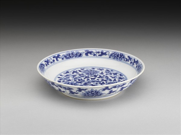 侈口窄唇,淺壁,矮圈足。胎質較薄,外壁畫盛開及待開之纏枝番蓮共十二朵,盤心雙圈青線內則繪綻放之番蓮三朵與未綻番蓮七朵,內壁口沿飾番蓮紋一周。底有「大清乾隆年製」三行六字篆款。