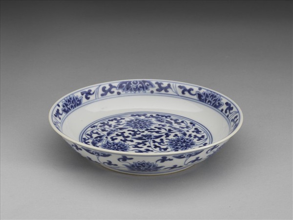 侈口窄唇,淺壁,矮圈足。胎質較薄,外壁畫盛開及待開之纏枝番蓮共十二朵,盤心雙圈青線內則繪綻放之番蓮三朵與未綻番蓮七朵,內壁口沿飾番蓮紋一周。底有「大清乾隆年製」三行六字篆款。