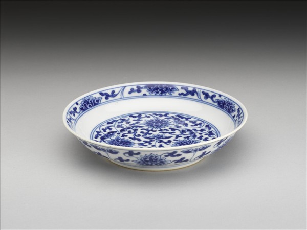 侈口窄唇,淺壁,矮圈足。胎質較薄,外壁畫盛開及待開之纏枝番蓮共十二朵,盤心雙圈青線內則繪綻放之番蓮三朵與未綻番蓮七朵,內壁口沿飾番蓮紋一周。底有「大清乾隆年製」三行六字篆款。