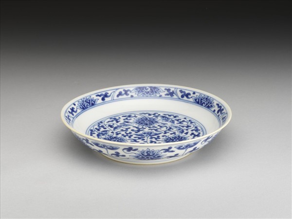 侈口窄唇,淺壁,矮圈足。胎質較薄,外壁畫盛開及待開之纏枝番蓮共十二朵,盤心雙圈青線內則繪綻放之番蓮三朵與未綻番蓮七朵,內壁口沿飾番蓮紋一周。底有「大清乾隆年製」三行六字篆款。