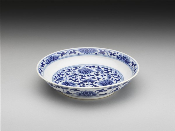 侈口窄唇,淺壁,矮圈足。胎質較薄,外壁畫盛開及待開之纏枝番蓮共十二朵,盤心雙圈青線內則繪綻放之番蓮三朵與未綻番蓮七朵,內壁口沿飾番蓮紋一周。底有「大清乾隆年製」三行六字篆款。