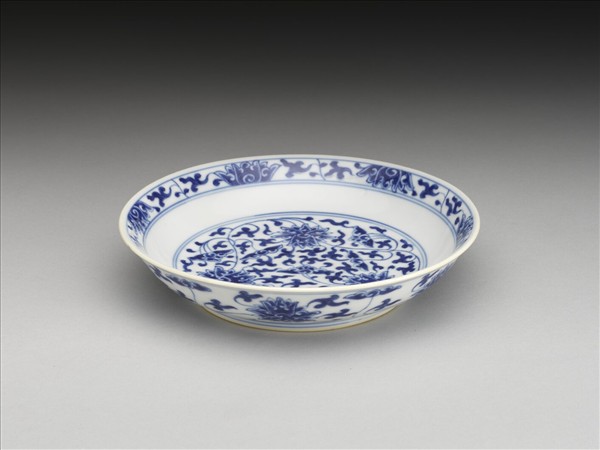 侈口窄唇,淺壁,矮圈足。胎質較薄,外壁畫盛開及待開之纏枝番蓮共十二朵,盤心雙圈青線內則繪綻放之番蓮三朵與未綻番蓮七朵,內壁口沿飾番蓮紋一周。底有「大清乾隆年製」三行六字篆款。