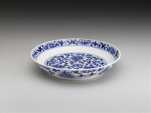侈口窄唇,淺壁,矮圈足。胎質較薄,外壁畫盛開及待開之纏枝番蓮共十二朵,盤心雙圈青線內則繪綻放之番蓮三朵與未綻番蓮七朵,內壁口沿飾番蓮紋一周。底有「大清乾隆年製」三行六字篆款。