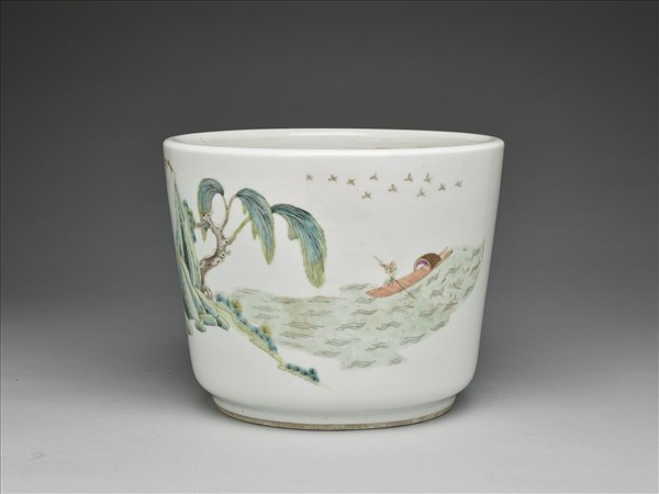 筒形花盆,直口、矮圈足,器底開一排水孔。胎質較厚,外壁半面繪山水、樹石、擺渡、人物,另半面留白。足緣無釉露胎,足底施白釉。