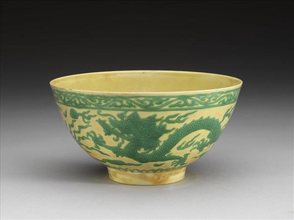 敞口,深壁,圈足。通體嬌黃釉,紋飾以綠彩繪成。外壁繪一龍、二鳳與一鶴,隙地加飾火焰與朵雲,口沿及底沿分繪卷草紋及蓮瓣紋一周。碗心繪如意雲紋和卷草紋組成的「壽」字紋。底有青花書「大清康熙年製」二行六字楷款,外加雙圈。