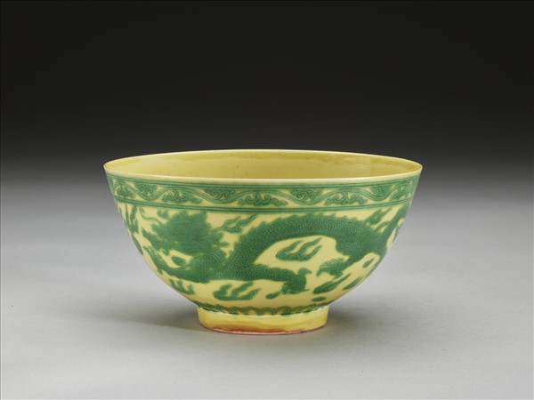 敞口,深壁,圈足。通體嬌黃釉,紋飾以綠彩繪成。外壁繪一龍、二鳳與一鶴,隙地加飾火焰與朵雲,口沿及底沿分繪卷草紋及蓮瓣紋一周。碗心繪如意雲紋和卷草紋組成的「壽」字紋。底有青花書「大清康熙年製」二行六字楷款,外加雙圈。