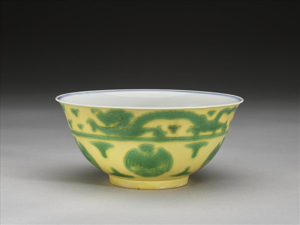 侈口微撇,深壁,矮圈足。外壁以嬌黃釉為地,上半部用綠彩畫雙龍戲珠,下半部飾五團鳳,隙地間飾火焰與朵雲紋。內壁施白釉,口沿以青花飾雙圈,碗心用青花書「壽」字紋與朵雲四枚,外飾雙圈。底有青花書「大清康熙年製」二行六字楷款,外加雙圈。