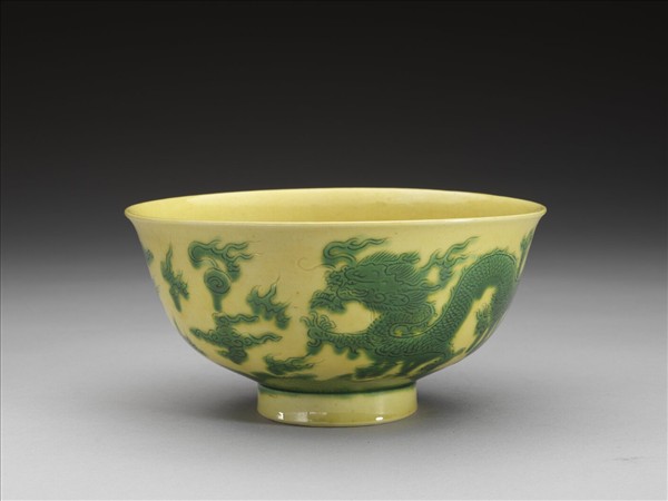 侈口,深壁,圈足。外壁以嬌黃釉為地,綠彩繪雙龍戲珠,隙間畫朵雲紋和火焰紋,底沿繪波濤紋一周。底有青花書「大清康熙年製」二行六字楷款,外加雙圈。