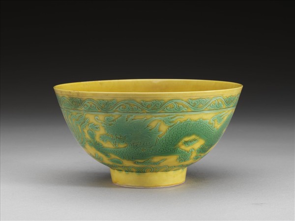 敞口,深壁,圈足。通體嬌黃釉,紋飾以綠彩繪成。外壁繪一龍、二鳳與一鶴,隙地加飾火焰與朵雲,口沿及底沿分繪卷草紋及蓮瓣紋一周。碗心繪如意雲紋和卷草紋組成的「壽」字紋。底有青花書「大清康熙年製」二行六字楷款,外加雙圈。