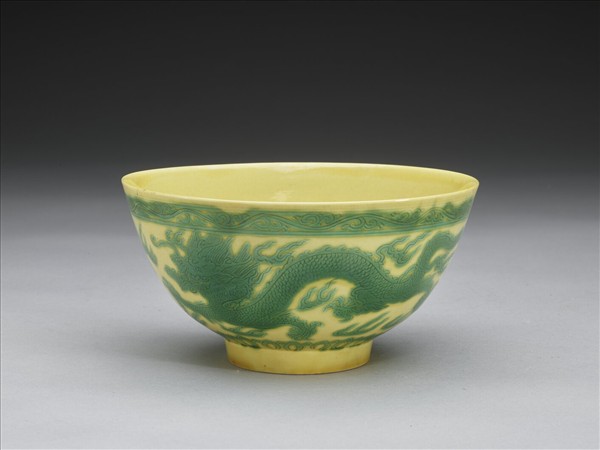 敞口,深壁,圈足。通體嬌黃釉,紋飾以綠彩繪成。外壁繪一龍、二鳳與一鶴,隙地加飾火焰與朵雲,口沿及底沿分繪卷草紋及蓮瓣紋一周。碗心繪如意雲紋和卷草紋組成的「壽」字紋。底有青花書「大清康熙年製」二行六字楷款,外加雙圈。
