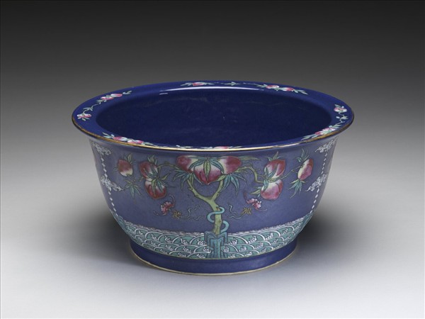桶形花盆,撇口折沿、圈足,器底開一排水孔。器身為粉彩藍地,裝飾波濤、壽桃、蝙蝠及綬帶等象徵長壽的紋飾。口沿與折沿處分別裝飾金彩及壽桃紋一周。