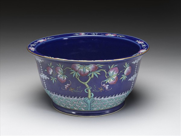 桶形花盆,撇口折沿、圈足,器底開一排水孔。器身為粉彩藍地,裝飾波濤、壽桃、蝙蝠及綬帶等象徵長壽的紋飾。口沿與折沿處分別裝飾金彩及壽桃紋一周。