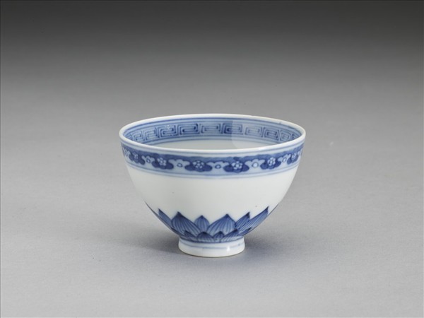 口部微外侈,弧形壁、上豐下斂,圈足。內、外壁口沿下分飾回紋、花瓣紋一周,外壁底邊飾蓮瓣紋二層一周,中段留白,碗心飾幾何花卉紋。底有青花書「乾隆年製」四字二行篆款。