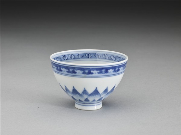 口部微外侈,弧形壁、上豐下斂,圈足。內、外壁口沿下分飾回紋、花瓣紋一周,外壁底邊飾蓮瓣紋二層一周,中段留白,碗心飾幾何花卉紋。底有青花書「乾隆年製」四字二行篆款。