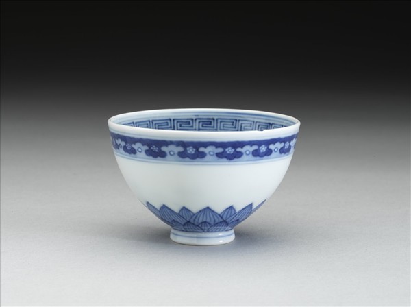 口部微外侈,弧形壁、上豐下斂,圈足。內、外壁口沿下分飾回紋、花瓣紋一周,外壁底邊飾蓮瓣紋二層一周,中段留白,碗心飾幾何花卉紋。底有青花書「乾隆年製」四字二行篆款。