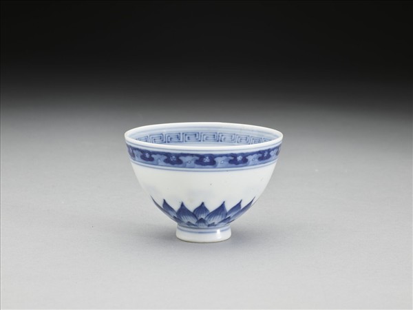 口部微外侈,弧形壁、上豐下斂,圈足。內、外壁口沿下分飾回紋、花瓣紋一周,外壁底邊飾蓮瓣紋二層一周,中段留白,碗心飾幾何花卉紋。底有青花書「乾隆年製」四字二行篆款。