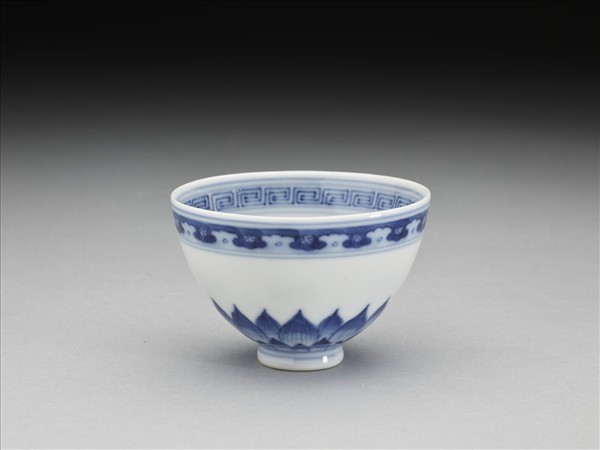 口部微外侈,弧形壁、上豐下斂,圈足。內、外壁口沿下分飾回紋、花瓣紋一周,外壁底邊飾蓮瓣紋二層一周,中段留白,碗心飾幾何花卉紋。底有青花書「乾隆年製」四字二行篆款。