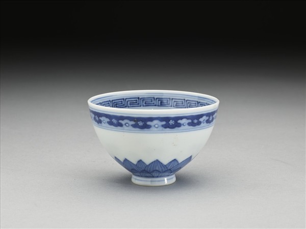 口部微外侈,弧形壁、上豐下斂,圈足。內、外壁口沿下分飾回紋、花瓣紋一周,外壁底邊飾蓮瓣紋二層一周,中段留白,碗心飾幾何花卉紋。底有青花書「乾隆年製」四字二行篆款。