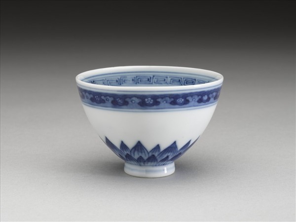 口部微外侈,弧形壁、上豐下斂,圈足。內、外壁口沿下分飾回紋、花瓣紋一周,外壁底邊飾蓮瓣紋二層一周,中段留白,碗心飾幾何花卉紋。底有青花書「乾隆年製」四字二行篆款。
