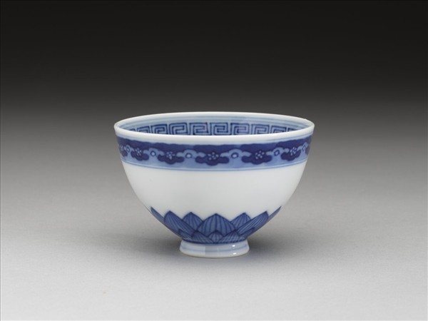 口部微外侈,弧形壁、上豐下斂,圈足。內、外壁口沿下分飾回紋、花瓣紋一周,外壁底邊飾蓮瓣紋二層一周,中段留白,碗心飾幾何花卉紋。底有青花書「乾隆年製」四字二行篆款。