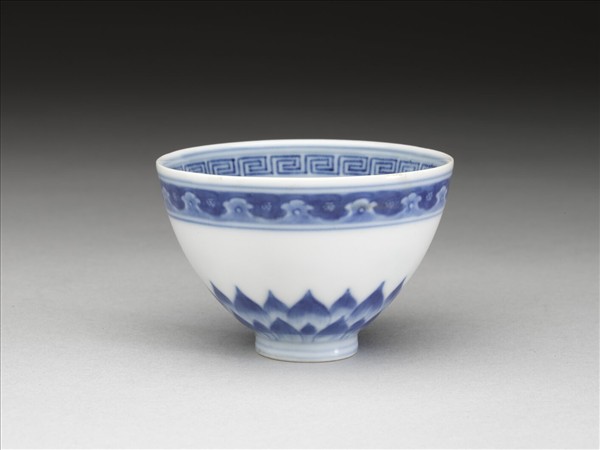 口部微外侈,弧形壁、上豐下斂,圈足。內、外壁口沿下分飾回紋、花瓣紋一周,外壁底邊飾蓮瓣紋二層一周,中段留白,碗心飾幾何花卉紋。底有青花書「乾隆年製」四字二行篆款。