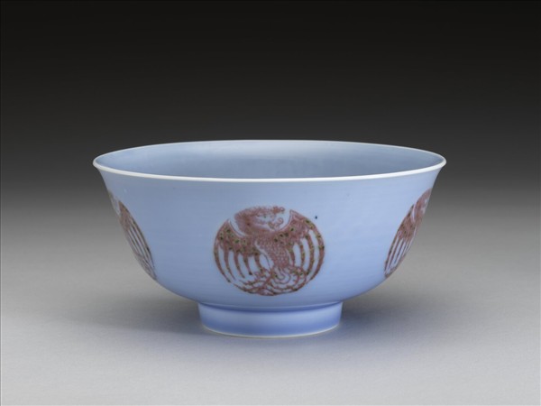 圓口,唇緣微外侈,弧形深壁,平底,矮圈足。器壁通施天藍釉,外壁裝飾五個紅彩團鳳紋,碗心亦繪一團鳳紋,鳳首、軀體與鳳尾成S型,雙翅展開於兩側,使圖案成圓形,紅彩發色呈暗紅色,帶綠色苔點。底有青花書「大清雍正年製」二行六字楷款,外加雙圈。
