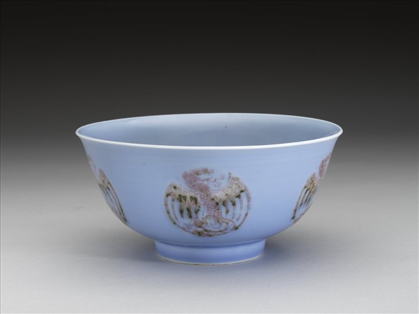圓口,唇緣微外侈,弧形深壁,平底,矮圈足。器壁通施天藍釉,外壁裝飾五個紅彩團鳳紋,碗心亦繪一團鳳紋,鳳首、軀體與鳳尾成S型,雙翅展開於兩側,使圖案成圓形,紅彩發色呈淡紅色,帶綠色苔點。底有青花書「大清雍正年製」二行六字楷款,外加雙圈。