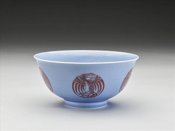 圓口,唇緣微外侈,弧形深壁,平底,矮圈足。器壁通施天藍釉,外壁裝飾五個描紅團鳳紋,碗心亦繪一團鳳紋,鳳首、軀體與鳳尾成S型,雙翅展開於兩側,使圖案成圓形,線條粗細分明。底有青花書「大清雍正年製」二行六字楷款,外加雙圈。