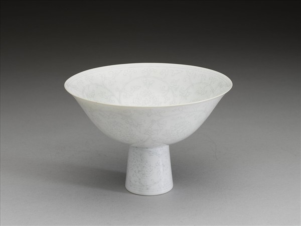 撇口,弧壁,高圈足,足部上窄下寬且中空,近底處微外侈。通體施白釉,白釉泛青,內、外壁飾纏枝番蓮六朵,足壁亦飾纏枝番蓮紋,高足上部與碗底接合處飾蓮瓣紋一周,內、外口沿及足之上下部各加飾細線二道,紋飾刻劃仿透雕效果。胎壁勻薄,足底露胎。碗心有「大清乾隆年製」雙行六字楷款,外加雙圈。